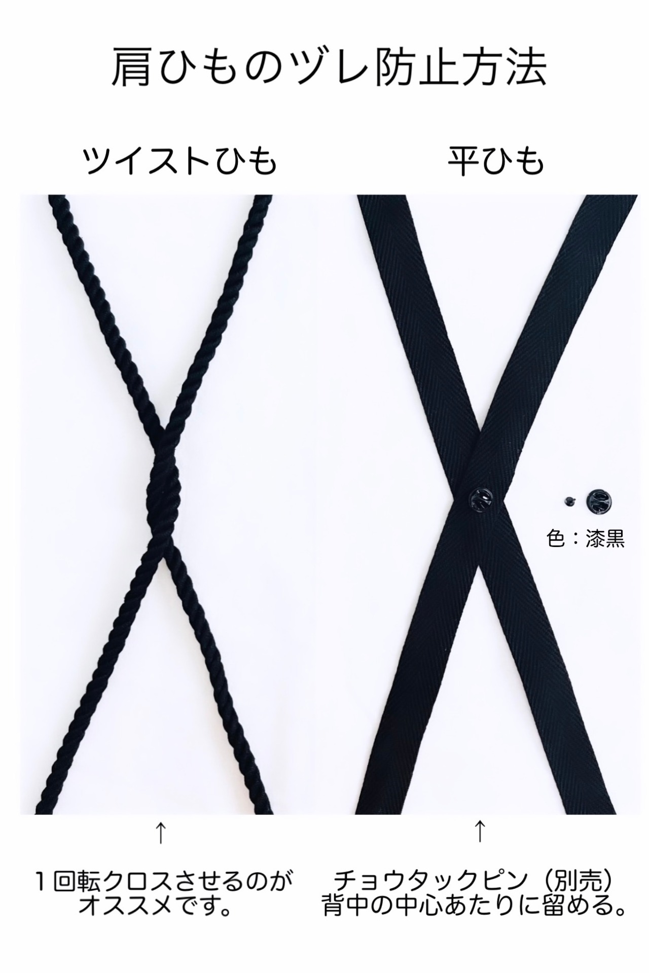 平ひもを選ばれる際は、チョウタックピン(肩ズレ防止アイテム)の購入もお薦めしております。